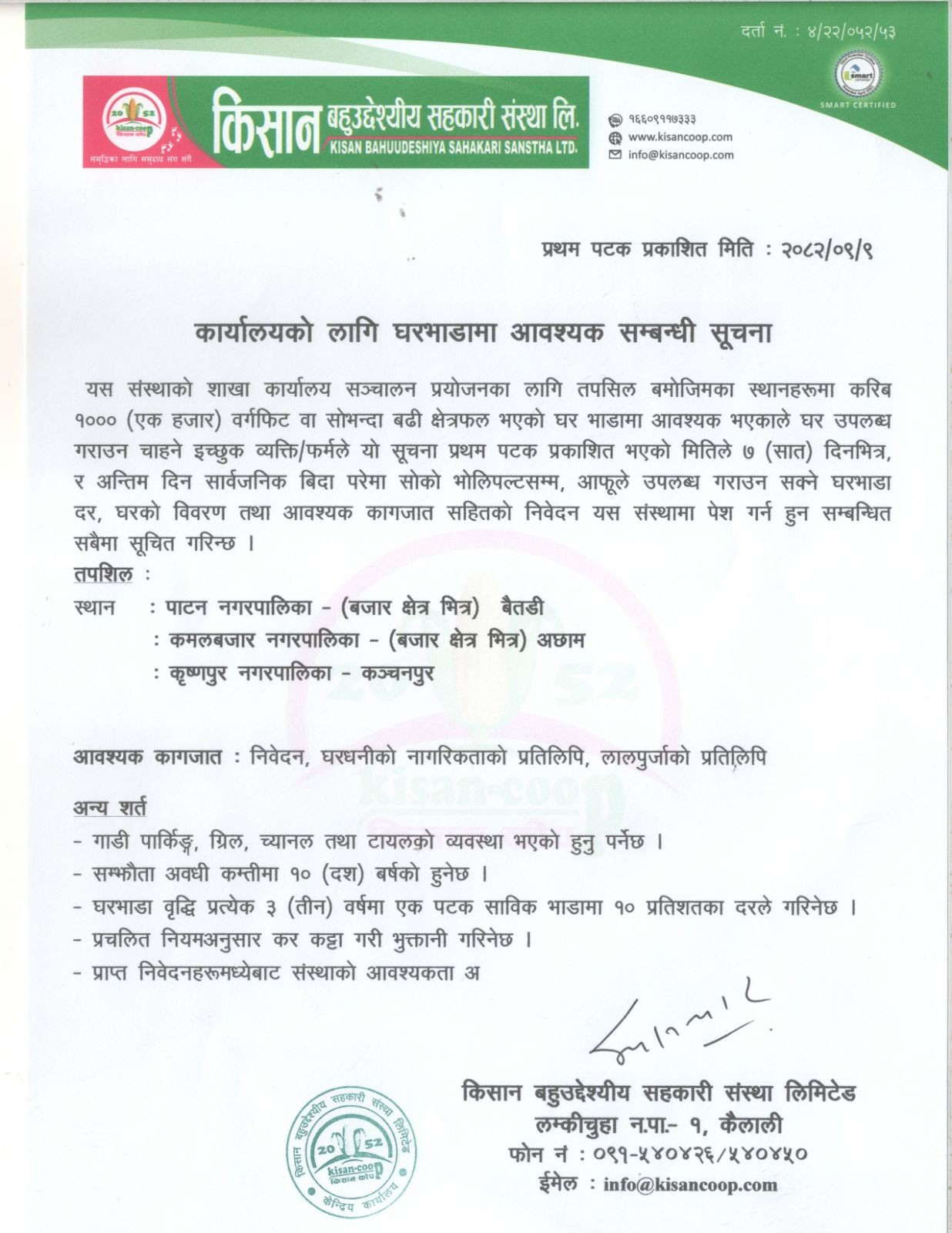 कार्यालयको लागि घरभाडामा आवश्यक सम्बन्धि सूचना !